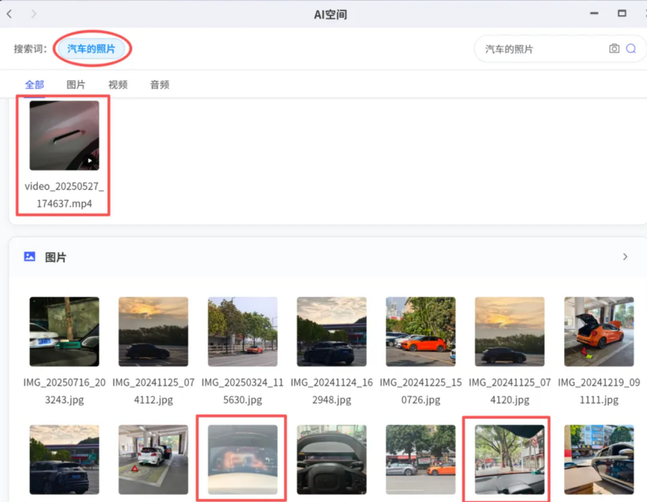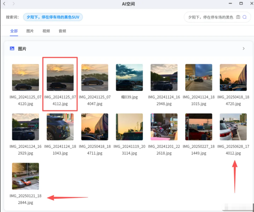AI空间的强大,源于其对文件内容的深度理解。以图片搜索为例,系统不仅能识别画面中的汽车,还能通过EXIF信息(如拍摄时间、地点)或图片描述文字进行关联搜索。例如,搜索“夕阳下,停在停车场的黑色SUV”,系统能结合画面内容与元数据,精准定位符合条件的照片。