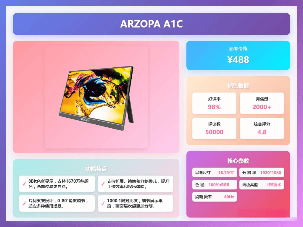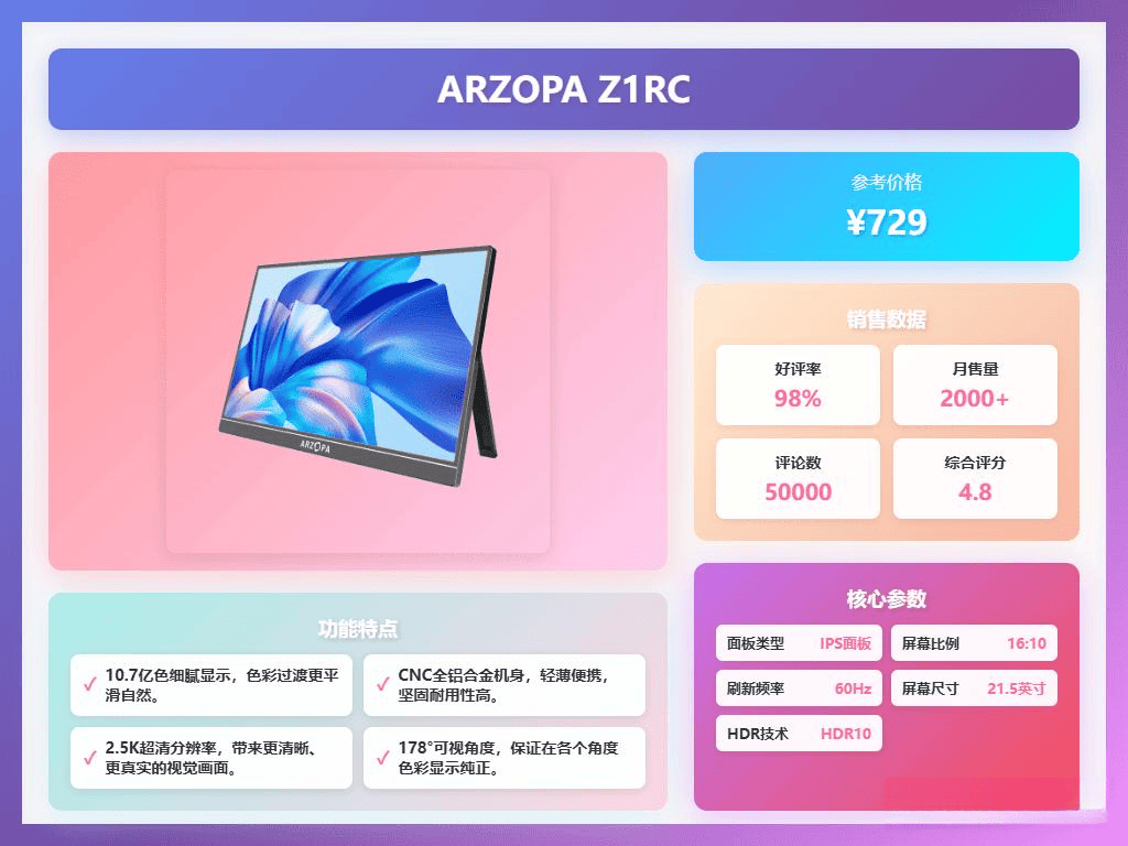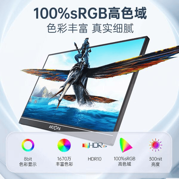 ARZOPA Z1RC的分辨率高达2.5K,画面清晰细腻,适合图片浏览和文档编辑。它的色彩表现也非常出色,100% sRGB高色域让画面色彩丰富,细节一览无遗,满足日常办公和娱乐需求。